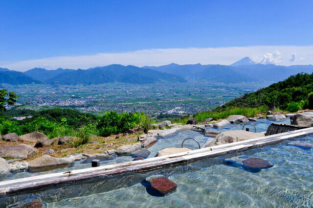 この温泉は山のてっぺんにあるので甲府盆地が一望でき、富士山も綺麗にみえるという絶景で有名な温泉です。